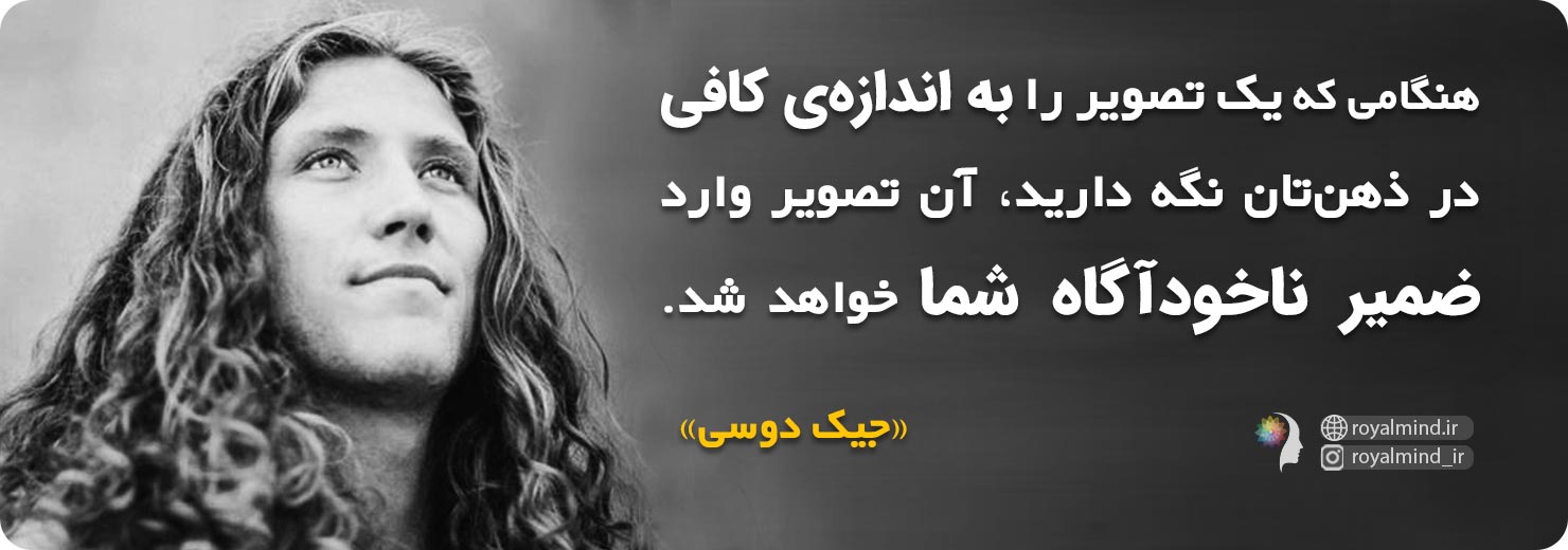 در همین راستا، "جیک دوسی" معتقد است، هنگامی که شما یک تصویر مثبت و زیبا از آرزوها و رؤیاهای خود را در ذهنتان ایجاد کنید، و سپس از نظر عاطفی نیز با آن درگیر شوید، میتوانید تنظیمات کدهای موجود در ضمیر ناخودآگاهتان را تغییر دهید و آرزوها و خواستههایتان را به زندگی خود جذب کنید. (برای اثبات این موضوع که آرزوها و خواستههای شما دور از دسترس نیستند و ترسها و باورهای محدودکننده نمیتوانند شما را در مسیر رسیدن به خواستهها و آرزوهایتان متوقف کنند، کتاب الکترونیکی و صوتی "اصول هدفمندی" اثر "جیک دوسی" (کلیک کنید)، را از دست ندهید).