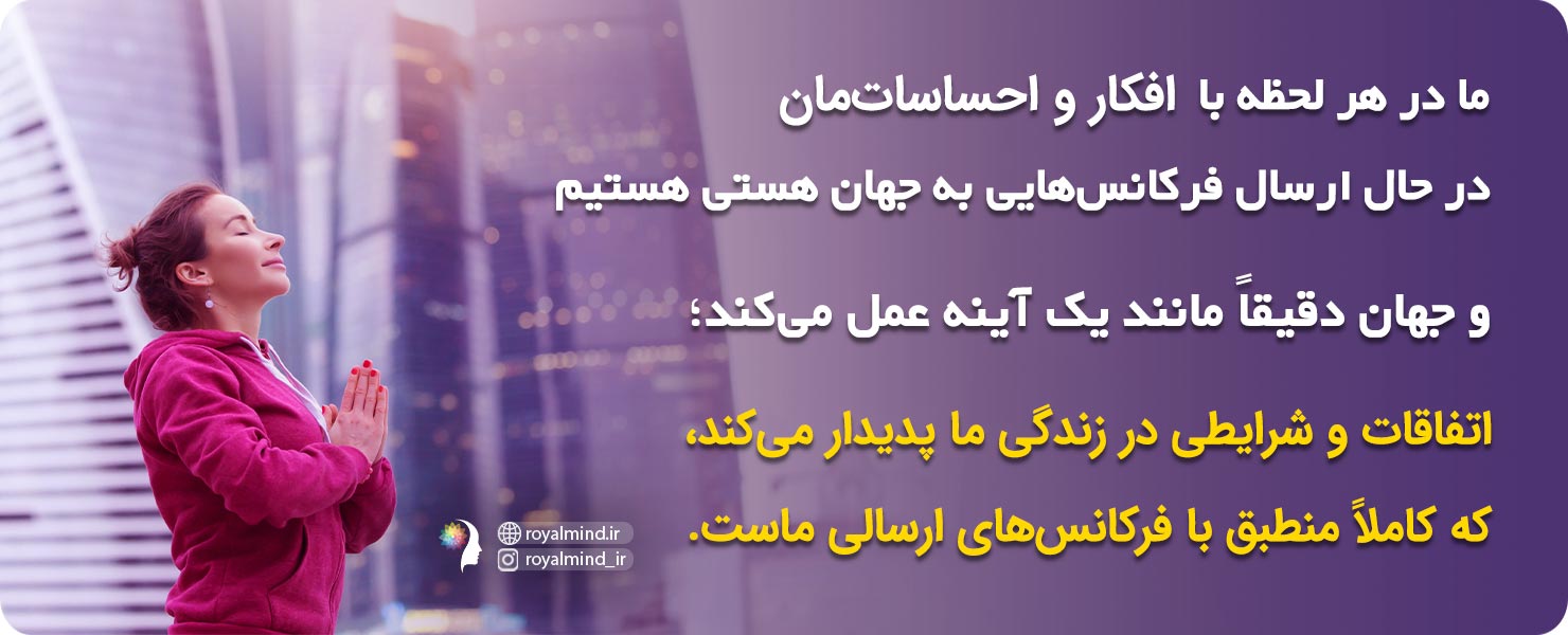 ما در هر لحظه با افکارمان (که اغلب به صورت ناخودآگاه هستند) در حال ارسال فرکانسهایی به جهان هستی (کائنات) هستیم و جهان دقیقاً مانند یک آینه عمل میکند؛ اتفاقات، شرایط، فرصتها، اشخاص و ایدههایی در زندگی ما پدیدار میکند، که کاملاً منطبق و همسنگ با فرکانسهای ارسالی ماست.