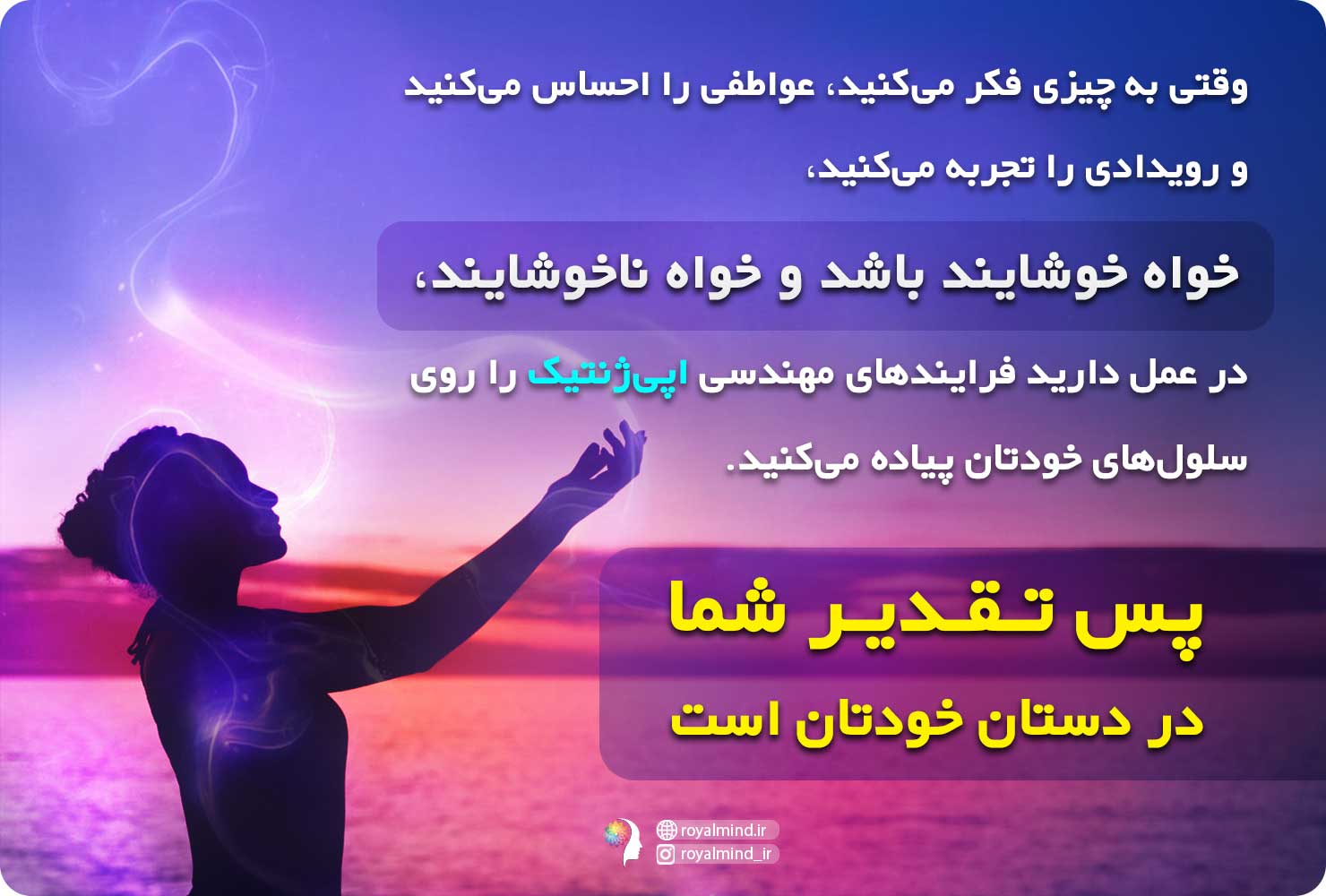 وقتی به چیزی فکر میکنید، عواطفی را احساس میکنید و رویدادی را تجربه میکنید، خواه خوشایند باشد و خواه ناخوشایند، در عمل دارید فرایندهای مهندسی اپیژنتیک را روی سلولهای خودتان پیاده میکنید. پس تقدیر شما در دستان خودتان است.