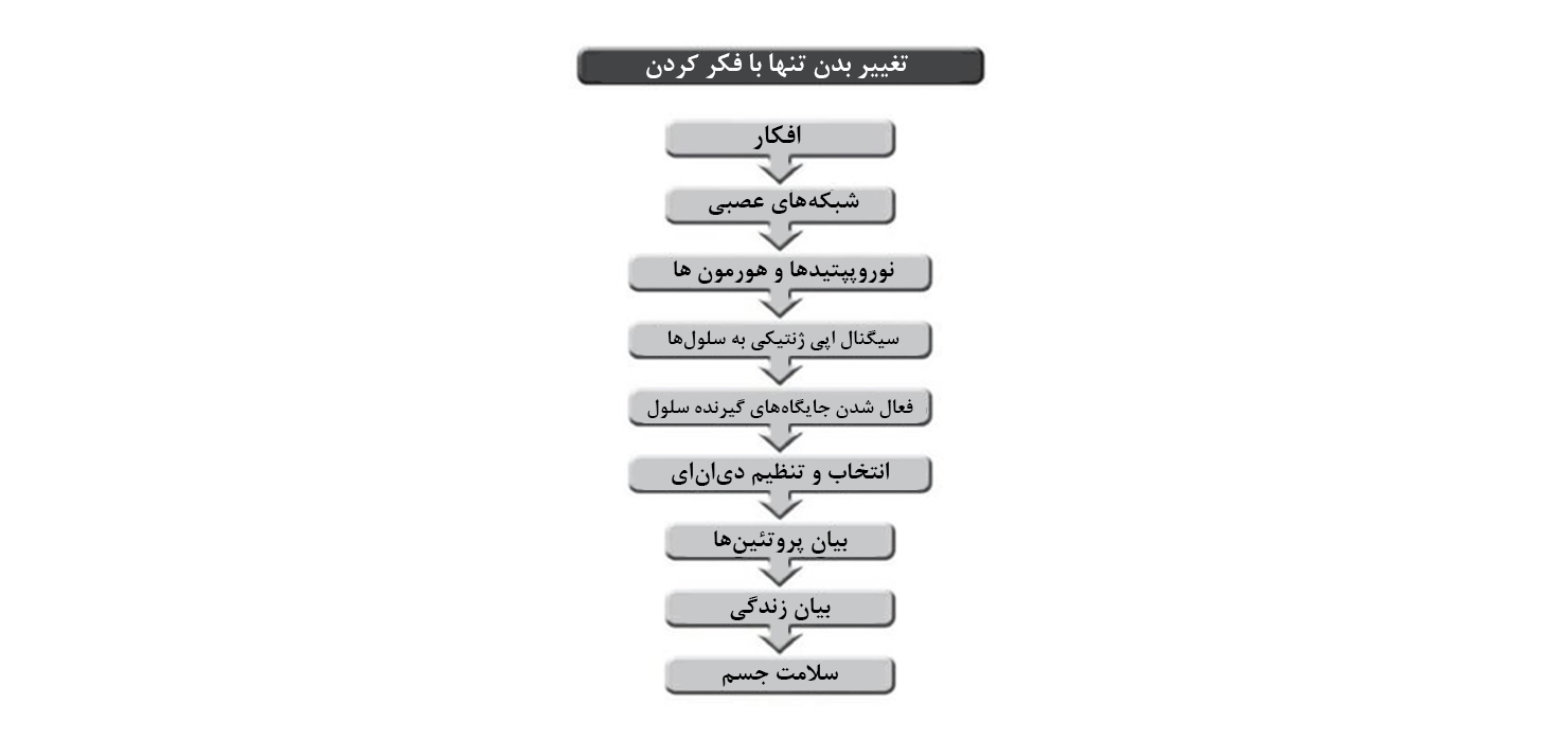 در تصویر زیر که از کتاب «قدرت باور» نوشته «دکتر جو دیسپنزا» گرفته شده است میتوانید مسیری که از افکار تا تغییر بدن طی میشود را ببینید، برای اینکه بیشتر با جزئیات این مسیر آشنا شوید حتماً این کتاب فوقالعاده را تهیه و مطالعه کنید: