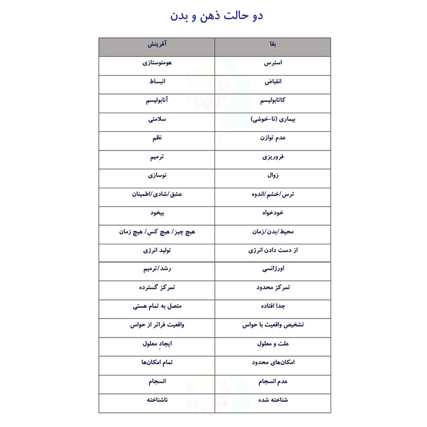 ما در طول روز حالتهای وجودی مختلفی داریم، گاهی ناراحت و عصبی هستیم، گاهی خوشحال و شکرگزاریم و حس میکنیم تمام کائنات با ما همراه هستند و ... تمامی این حالتها به دو حالت متفاوت بقا و آفرینش ختم میشوند. در حالت بقا، ما برای حفظ و بقای خود میجنگیم و در حالت آفرینش ما زندگی ما مملو از عشق و لذت و خلاقیت خواهد بود. در این حالت میتوانیم راهحلهایی برای مشکلات بیابیم و چالشها را از سر بگذرانیم و رشد کنیم.