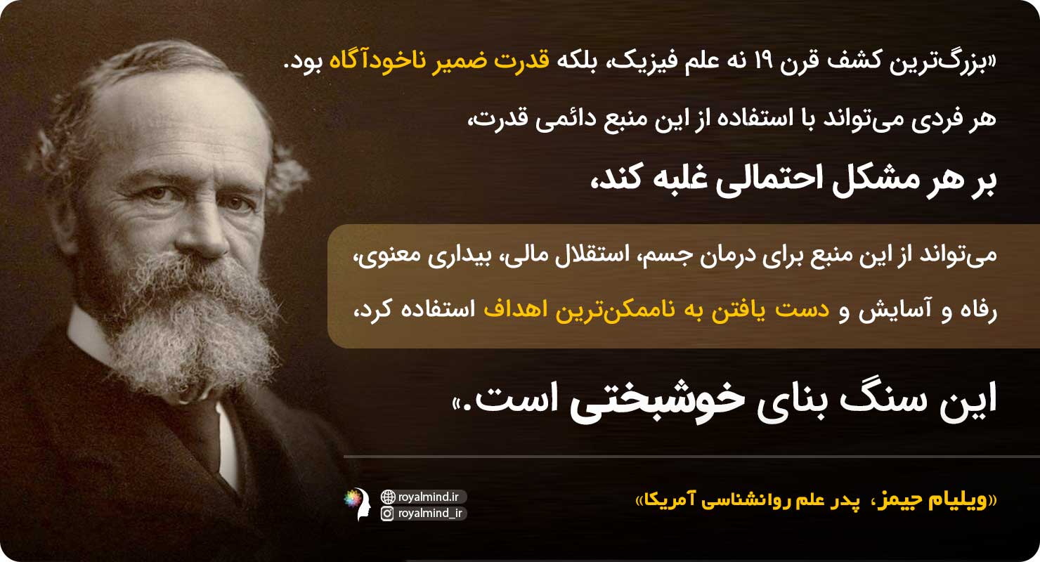 ابتدا کمی درباره مراقبه و مدیتیشن صحبت کنیم و از فواید آن بهره ببریم. ویلیام جیمز، پدر علم روانشناسی آمریکا گفته است که: «بزرگترین کشف قرن نوزدهم مربوط به علم فیزیک نبود، بلکه قدرت ضمیر ناخودآگاه بود که با باور تقویت شده بود، هر فردی میتواند با استفاده از این منبع دائمی قدرت، بر هر مشکل احتمالی غلبه کند، میتواند از این منبع برای غلبه کردن بر تمام ضعفها، درمان جسم، استقلال مالی، بیداری معنوی، رفاه و آسایش و دست یافتن به ناممکنترین اهداف استفاده کرد، این سنگ بنای خوشبختی است.»
