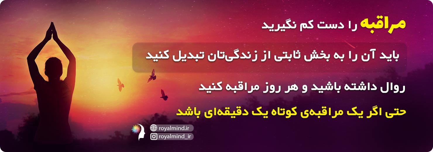نکتهی مهم اینکه نباید مراقبه را به دید یک فعالیت تفریحی یا تفننی نگاه کنید. باید آن را به بخش ثابتی از زندگیتان تبدیل کنید. همانطور که با یک بار باشگاه رفتن، بجز گرفتگی عضلات چیزی عایدتان نمیشود، با یک بار مراقبه کردن نیز مطمئناً تغییری در زندگی شما ایجاد نخواهد شد. باید روال داشته باشید و هر روز مراقبه کنید، حتی اگر یک مراقبهی کوتاه یک دقیقهای باشد.