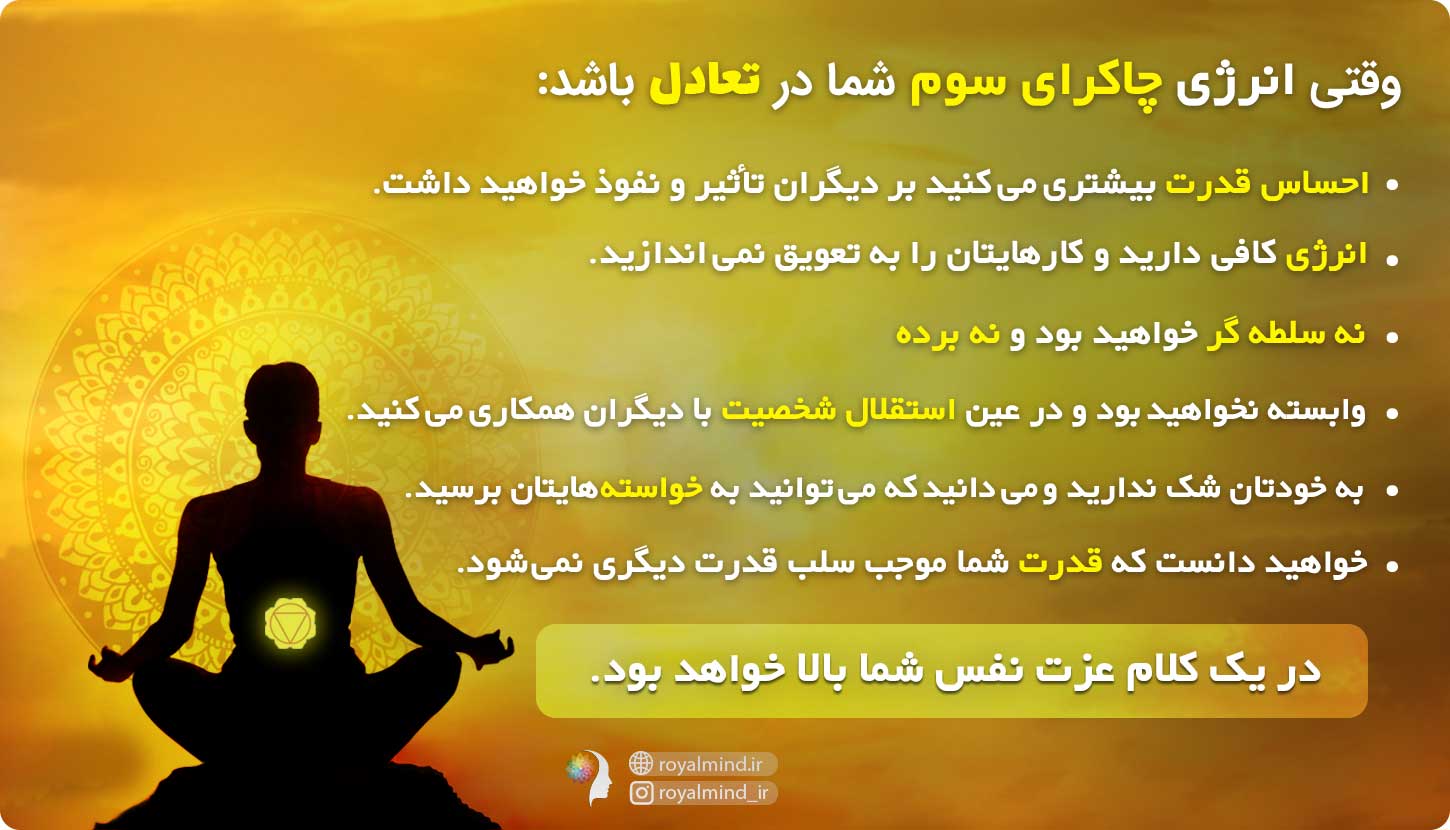 تعادل در چاکرای سوم: زمانی که چاکرای سوم متعادل است، شما به جای عدم فعالیت که نشانه فعالیت کم و به جای واکنشی بودن که نشانه فعالیت زیاد این چاکرا است، فردی کنشی یا پرو-اکتیو میشوید. در این حالت، مسئول و قابل اعتماد هستید، مسئولیت اهدافتان را بر عهده میگیرید، خودتان را قربانی شرایط نمیدانید، باارادهاید و اعتماد به نفس لازم برای ایجاد تغییرات مؤثر در زندگی را دارید و میتوانید به اهدافی که برای خودتان مشخص میکنید برسید. از عزتنفس خوبی برخوردارید و مستقل و مسلط بر شرایطید و تأثیر و نفوذ زیادی روی اطرافیان خود دارید.