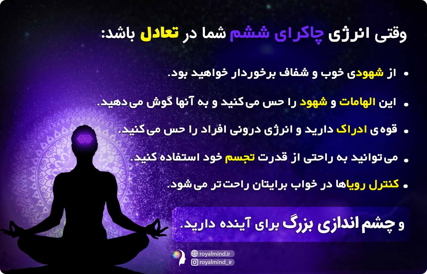 تعادل در چاکرای چشم شوم: زمانی که چشم سوم شما متعادل است، از شهودی خوب و شفاف برخوردار خواهید بود. این شهود را حس می‌کنید و به آن گوش می‌دهید. بصیرت و قوه‌ی ادراک دارید و می‌توانید درون مردم را ببینید. قوه‌ی تخیل خوبی دارید و قادر به تجسم خلاق هستید. می‌توانید به راحتی از قدرت تجسم خود استفاده کنید. در این حالت برای زندگی خود چشم‌انداز دارید. باز بودن این مرکز باعث افزایش وضوح فکری می‌شود.