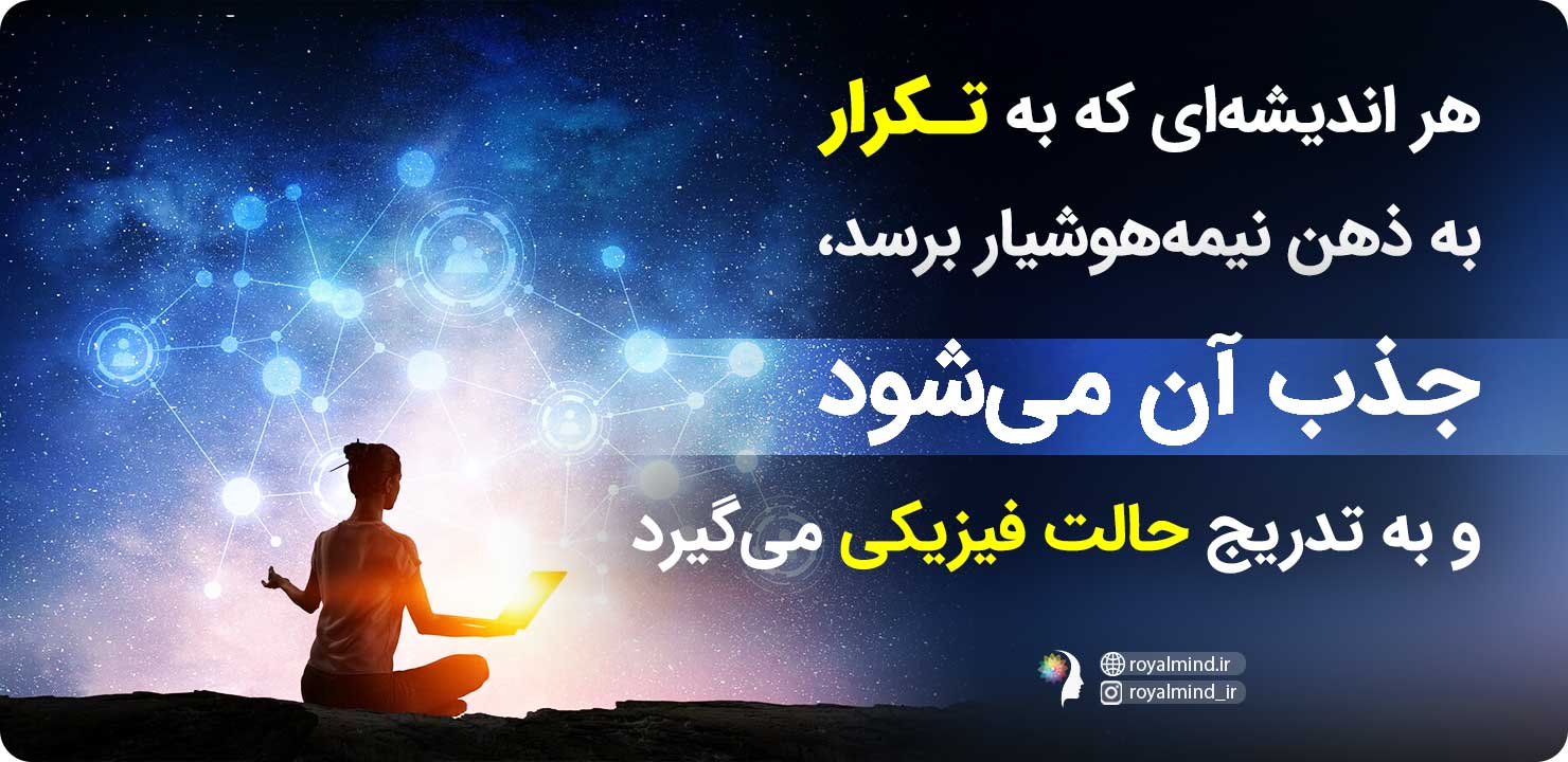 اینجا ما نقشه ذهن را می سازیم. بارها در این باره حرف زدیم، شما ضمیر خودآگاه، ضمیر ناخودآگاه و بدن دارید نیرویی هست که به درون ضمیر خودآگاهتان جاری میشود. میتوانید اسمش را روح خالص، انرژی یا هرچیز دیگری بگذارید اما وقتی این نیرو به ذهنمان جاری میشود هیچ شکلی ندارد، ما میتونیم آن را به هرشکلی که بخواهیم دربیاوریم پس به چیزی که میخواهیم فکر میکنیم تصویرش را میسازیم و آن تصویر را نگه میداریم. تکرار میکنیم. تکرار تکرار تکرار. با این کار تصویر را به ضمیر ناخودآگاه القا میکنیم. نیرویی درونتان هست که تصویر ذهنی شما را می گیرد و آن در زندگی محقق میکند. پس وقتی این تصویر را به ضمیرناخودآگاه میدهید، همزمان با افکارتان آن انرژی را به کائنات میفرستید. امواج افکار، امواج کیهانی هستند و به زمان و فضا نفوذ میکنند و با هرچیزی که با او هماهنگ میشود و فرکانس مشابهی داشته باشد ترکیب میشود. ضمیر ناخودآگاه که هوش جهانی است کاری میکند که آن فکر از طریق شما محقق شود و مرتب ایمان شما بیشتر و بیشتر میشود.