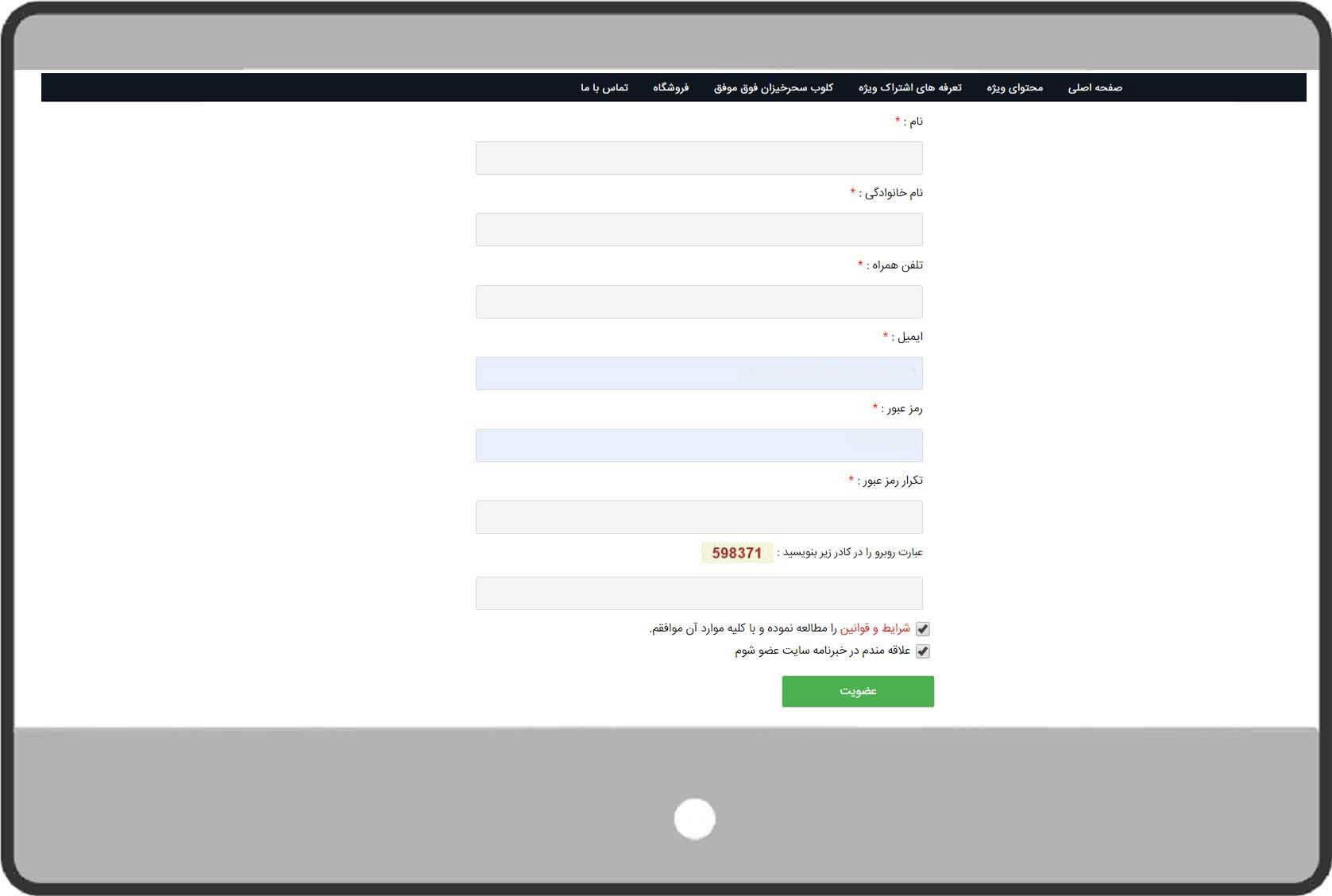 گزینه ثبتنام را بالای تمام صفحات وبسایت میتوانید ببینید. کافی است روی آن کلیک کنید و وارد صفحهای که در زیر مشاهده میکنید شوید. در این صفحه شما باید مشخصات خود را وارد کنید، نام و نامخانوادگی، ایمیل و شماره موبایل و رمز عبور دلخواه خود را وارد کنید. سپس بر روی دکمه عضویت کلیک کنید.