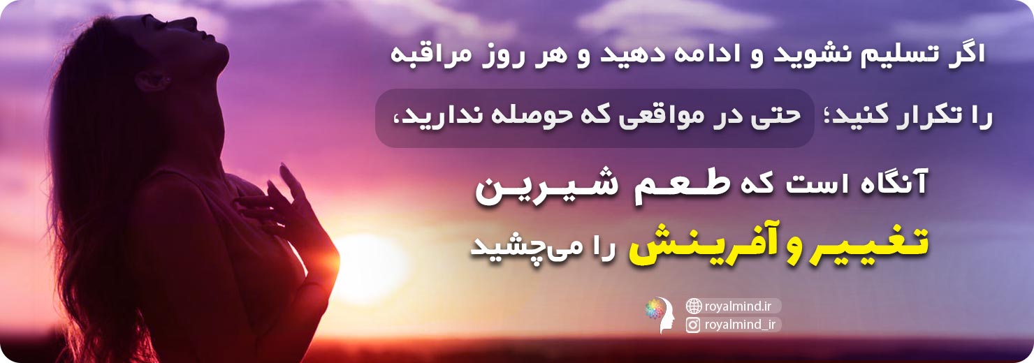 اگر تسلیم نشوید و ادامه دهید و هر روز مراقبه را تکرار کنید، حتی در مواقعی که حوصله ندارید، کار دارید، یا هر چیز دیگری(همان بهانههایی که بدن ما به ما القا میکند) آنگاه است که طعم شیرین تغییر و آفرینش را میچشید و وقتی چشیدید هیچگاه آن را ترک نخواهید کرد و حتی خودتان را برای آفرینشهای بزرگتر در زندگیتان آماده میکنید.