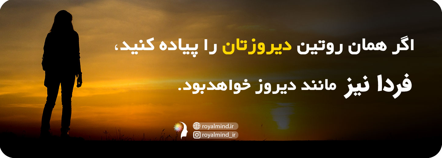 اگر برنامهی روزتان را نگاه کنید، از موقع بیداری تا موقع خواب، میتوانید برنامهی دیروز یا امروز (گذشته) را بردارید و آن را در جایی که متعلق به فرداست، قرار دهید - و برای روزهای بعد از آن هم همینطور. بیایید قبول کنیم: اگر همان روتین دیروز را پیاده کنید، منطقی است اگر بگوییم فردا نیز مانند دیروز خواهد بود. آیندهی شما صرفاً بازگشتی از گذشتهتان است. چون دیروزتان دارد فردایتان را میسازد.