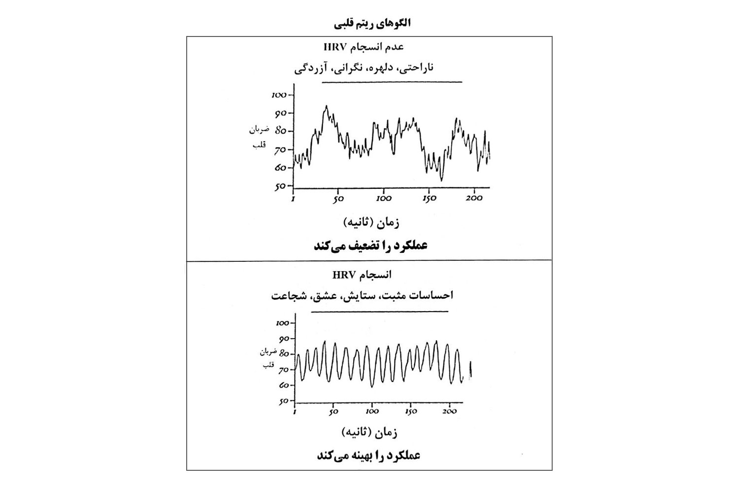 این نمودارها توسط مؤسسهی هارتمث تهیه شدهاند. همانطور که میبینید نمودار بالا ریتمی نامنظم دارد که درنتیجهی احساساتی مانند تنفر، بیقراری، نگرانی و دلهره ایجاد شده است. اما در نمودار پایین ریتم قلب منظم است. این ریتمِ منظم، با احساساتی همچون شکرگزاری، عشق، ستایش و مهربانی ایجاد میشود و عملکرد را بهبود میبخشد. در این حالت قدرت تصمیمگیری و خونسردی بالا میرود و فرد میتواند در موقعیتهای تنشزا بهترین عملکرد را از خود نشان دهد.